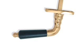 Klassiskt spanjoletthandtag i mässing med svart trähylsa i björk. Greppet avslutas med en rund ändknopp.