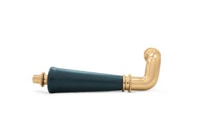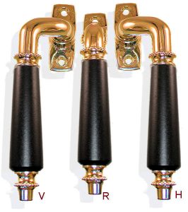 Ett extraordinärt spanjoletthandtag i mässing dubbel pärlrand med svart trähylsa i björk. Greppet avslutas med en konad ändknopp.
