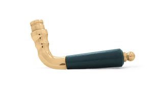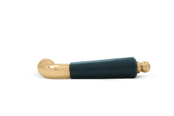 Ett klassiskt handtag i mässing med svart trähylsa i björk. Greppet avslutas med en rund ändknopp, avsett för innerdörr.